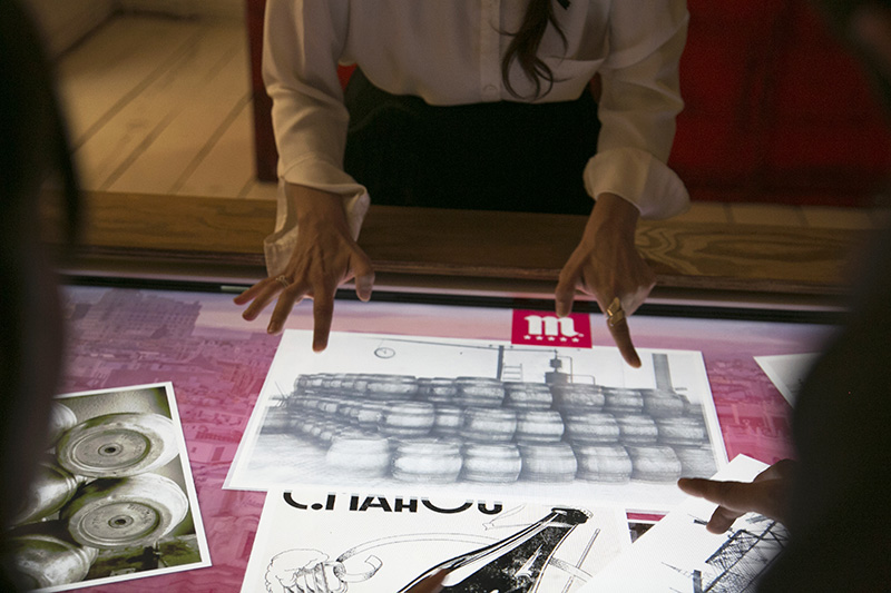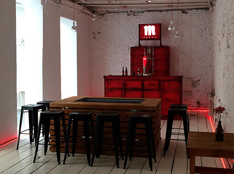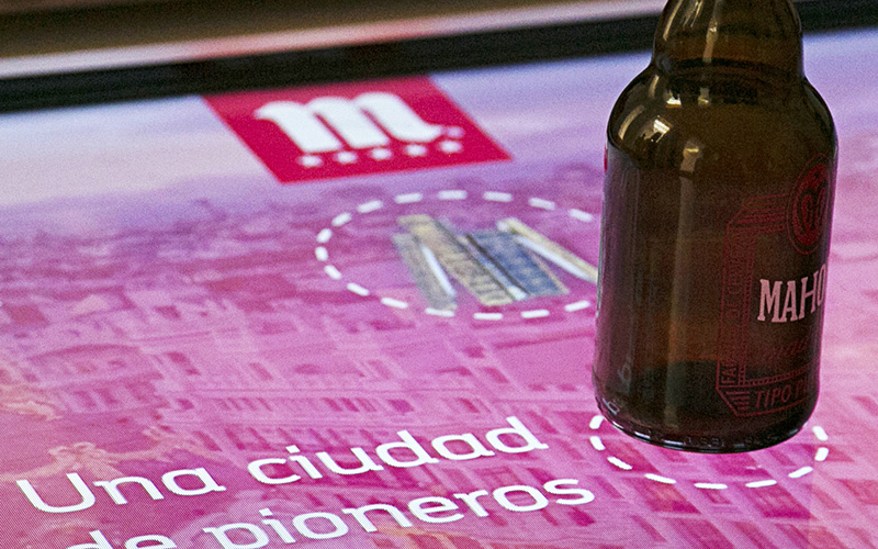 3- La mesa interactiva alrededor de la cual se va a desarrollar la experiencia. Esta mesa, además de detectar el punto en el que se apoya un objeto en la pantalla mediante un marco IR, también es capaz de identificarlo y diferenciarlo de cualquier otro, gracias a un dispositivo de radio frecuencia construido ad hoc. Algo imprescindible porque el guión se articula en torno a 5 botellas de Mahou que despliegan los 5 menús que componen la aplicación.